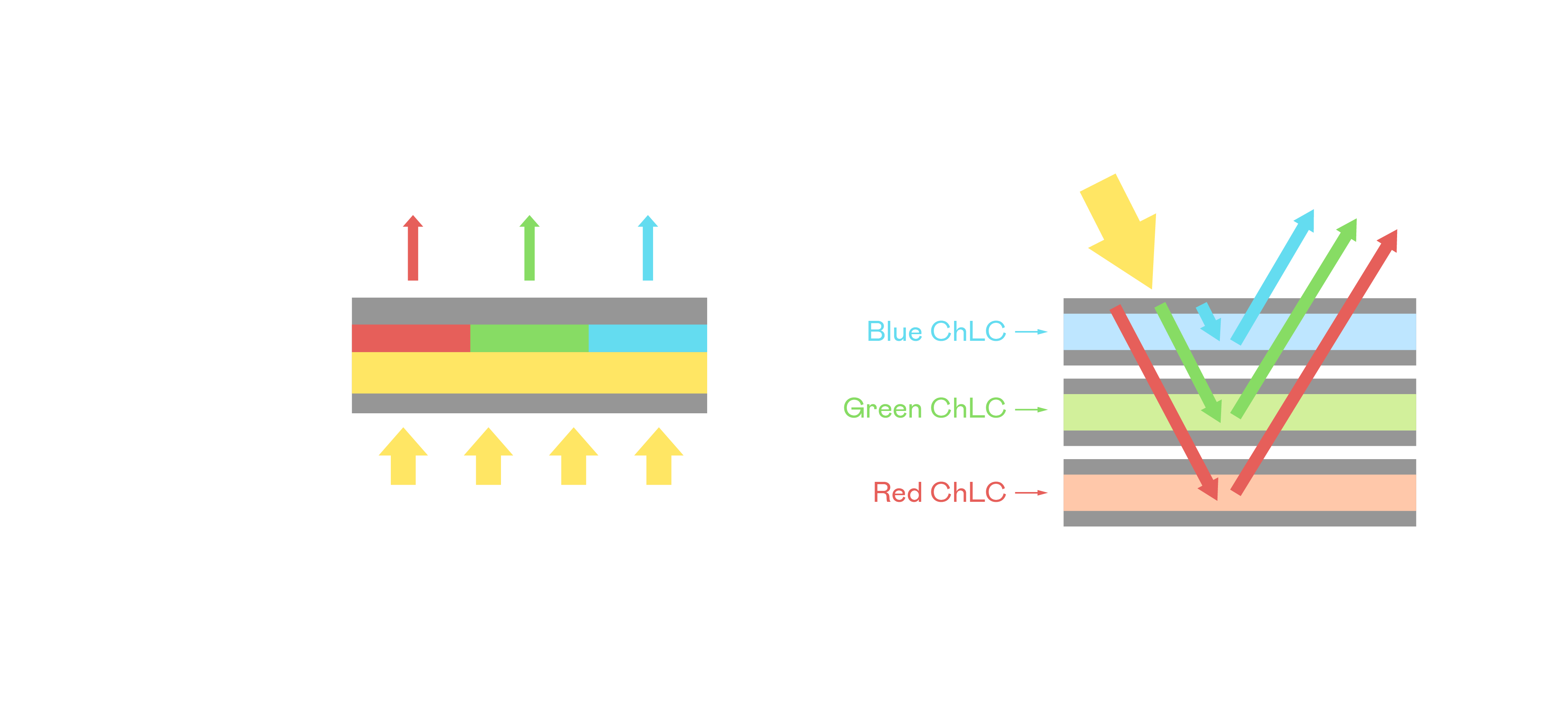 mile米乐胆固醇液晶显示器是由红、绿、蓝三层胆固醇液晶面板堆叠而成,并采用无彩色滤光片设计,减少环境光在反射过程中的损耗。